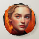 A girl with blue eyes on orange background, dark black and crimson, photoréalistic fantasies, personal iconographiy, detailed character design, shiny/glossy