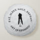 Caractéristiques de conception citation de golf mignonne "Manger, Dormir, Golf, Répéter ! Des questions?" en texte noir circulaire classique sur un fond réaliste de balle de golf. Également en noir, une silhouette de golfeur masculin en train de putter est au centre du texte. Le dos comporte un modèle pour un nom personnalisé ou un court texte en script chic noir assorti. Toutes les couleurs de cette conception autres que l'image de la balle de golf elle-même peuvent être facilement changées en n'importe quelle couleur de votre choix. Envoyez un message en utilisant le bouton en bas de cette liste ou écrivez à beachpausedesigns@gmail.com pour toute question ou demande d'options de personnalisation.