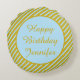 Ce magnifique coussin rond présente une image graphique d'une licorne de couleur bronzée avec une crinière et une queue de couleur arc-en-ciel. Il possède également des sabots de couleur dorée et une corne dorée brillante. La licorne est accompagnée d'une paire de nuages blancs moelleux avec un texte de couleur arc-en-ciel entre les deux qui dit "Joyeux anniversaire".