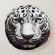 Coussin rond Jaguar noir et blanc avec des teintes rouges de couleur vive.