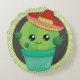 Un oreiller rond avec une jolie illustration d'un cactus vert assis dans un pot de fleurs. Gros yeux kawaii et portant un sombrero rouge. Le fond est un motif avec des volutes vert lime.