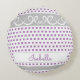 Ce coussin rond est simple mais élégant avec un motif représentant des pois lavande violets carrés avec des rayures grises et des volutes blanches. Le design est personnalisable avec un espace pour entrer un nom. Parfait pour une nurserie ou une chambre de fille.