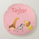 Joli et rose, ce coussin rond présente un arrière - plan rose avec une faune sauvage comme un zèbre, une girafe et un lion. Customisez votre nom en police rose. Personnalisez votre coussin dès aujourd'hui !