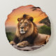 Beau Lion posé sur un rocher avec coucher de soleil de jungle derrière
