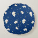 Coussin rond avec mouton mignon, lune et étoiles sur arrière - plan bleu foncé