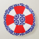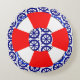 Round throw pillow with a red and white life preserver against a design of blue ship's wheels.