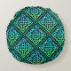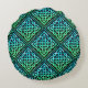 Un coussin rond d'un noeud celtique bleu-vert en diamant motif répété contre un arrière - plan noir.