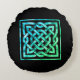 Un coussin rond d'un noeud celtique bleu-vert contre un arrière - plan noir.