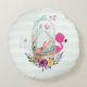 Coussin rond avec une jolie aquarelle illustration d'un oeuf assis à l'intérieur d'un panier en osier. Décoré de rubans, arcs, fleurs et petits coeurs aussi. Un flamant rose et un lapin lapin blanc se tiennent de part et d'autre en regardant la cargaison précieuse. Arrière - plan rayé vert pâle.