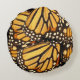 Cet oreiller rond décoratif présente un motif abstrait d'une adorable aile Monarch Butterfly (Danaus plexippus) aux couleurs orange, jaune, or, noir, marron et blanc.