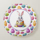 Cet oreiller rond est montré avec un joli imprimé festif d'oeufs de lapin de Pâques. Customisez cet objet ou achetez comme indiqué.