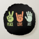 Cet oreiller de lancer audacieux et moderne présente trois signes emblématiques : le signe de paix, le geste de la main de l'amour et une paume ouverte symbolisant l'art. Avec des tons pastel doux de vert, d'orange et de crème contre un arrière - plan noir, ce design livre un message simple mais puissant : Paix, Amour, Art. Parfait pour les artistes, les créatifs et les esprits libres qui veulent apporter positivité et inspiration dans leur espace. Un accent élégant pour les studios, les chambres ou les salons, et un cadeau bien pensé pour les amateurs d'art.