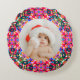 Photo Personnalisée Joyeux Noël Moderne Colorée Décoration Coussin Rond. Un motif de Noël festif, joyeux et lumineux jette un oreiller pour décorer votre maison et votre bureau. Ajoutez vos propres deux photos pour célébrer les souvenirs de famille. Pour budget maximaliste décoration de maison de Noël cadeaux. Dans les couleurs de Noël traditionnelles, chaudes, rouge, rose et orange, avec le vert et le bleu d'hiver. Fait un grand cadeau de conservation abordable pour les nouveaux parents, les grands-parents, les mères et pour elle. Un maximalisme joyeux !