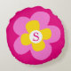 Gras monogramme graphique floral fille chambre ronde jetée oreiller. Coussin rond rose vif, jaune et rose foncé pour filles, idéal pour personnaliser un lit de filles.