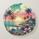 Lave oreiller à thème sur la plage. Jolie vue turquoise, turquoise et rose sur l'océan avec coucher de soleil et silhouettes de palmiers, belles fleurs tropicales et jetée et maison de plage.
