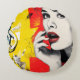 Deux femmes sont représentées dans un style pop art dynamique, l'une dans les tons bleu et jaune et l'autre en niveaux de gris avec rouge à lèvres gras. L'arrière - plan présente un mélange de motifs abstraits dans les tons rouge et jaune.