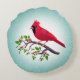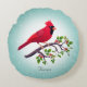 Beau cardinal rouge debout sur une branche d'arbre sur Coussin turquoise arrière - plan rond. Le texte, seulement sur le devant, peut être personnalisé.