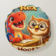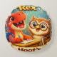 Inspiring nursery cushion description encourage a love for learning with this adorable Wrexham hoots round cushion this heartwarming design features Rex the dinosaur diligently riding at his desk while his best friend hoot the owl looks on with encouragement book in wing set against a magical story teal background this high detailed illustration captures the joy of discovery and education