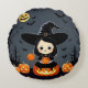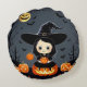 Une sorcière de dessin animé mignonne entourée de citrouilles lumineuses et de chauves-souris sous un ciel éclairé par la lune d'Halloween. Parfait pour les décorations saisonnières, les thèmes pour enfants ou les ambiances de vacances magiques.