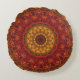 Un coussin rond avec un design élégant à la mandala, aux riches couleurs automnales de rouge/orange et jaune doré, un accessoire de maison très luxueux et classe.