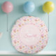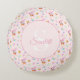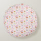 Transformez une nurserie ou une salle de jeux en jardin de conte de fées avec cet enchanteur coussin rond. Sur un fond rose bébé doux, un lapin rose joue de la trompette au milieu d'un monde fantaisiste de papillons violets, de cœurs souriants et de fleurs de jardin.