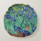 Vincent Van Gogh's Artwork "Irises" is featured on this round pillow. Irises is an oil painting by Dutch artist Vincent van Gogh. Painted in 1889, the work is a landscape with a cropped composition and is one of a series of several hundred paintings that van Gogh created at the Saint-Paul-de-Mausole asylum in Saint-Rémy-de-Provence, France, in the last year of his life, before he died in 1890. It has been in the permanent collection of The Getty in Los Angeles, California, since 1990. The painting depicts vibrantly blooming irises with dynamic brushstrokes. The flowers are a mix of deep blues and violets, contrasting with lush green leaves, red-orange earth, and yellow flowers in the background. Van Gogh's characteristic impasto technique adds texture and movement within the painting, creating an energetic and expressive feeling. The overall cropped composition of Irises includes broad areas of vivid color and monumental rippled irises overflowing the borders of the canvas, which helps move the viewer's eye throughout the canvas. ** Check out related products with this design in our store and discover more amazing options with this wonderful image: https://www.zazzle.com/collections/arty_gifts_for_the_van_gogh_fan_in_your_life-119079521028472120?rf=238919973384052768