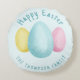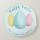 Watercolor Easter eggs in blue, yellow and pink colors on a light blue background color. There are also two personalizable text areas where the top one reads "Happy Easter" and the bottom is ideal for writing a family name or other custom text.