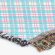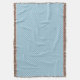 A light blue blanket with a subtle diamond pattern and beige fringe edges is shown. The image features both horizontal and vertical views.