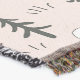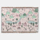 Un motif de style scandinave décrit la vie agricole entre montagnes, lacs et ruisseaux avec des animaux, des arbres, des maisons, des véhicules... même une montgolfière et des éoliennes — le tout sur un arrière - plan rose pastel