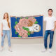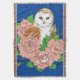 Une chouette grange avec un croissant de lune sur le front est assise parmi des fleurs roses sur un fond de bleu foncé.