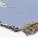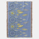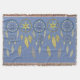 Decorative blue and yellow dream catchers and feather design on light blue throw.