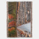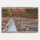 Vue de plain-pied d'une belle scène d'automne avec une voie ferrée traversant les érables à feuilles rouges de l'automne dans la péninsule supérieure du Michigan. Il s'agit d'un tableau numérique de style aquarelle qui séduira les voyageurs, les passionnés de train et ceux qui aiment voyager vers le nord.
