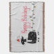 Illustration de chèvre noire avec chapeau de Père Noël rouge, chaîne de lumières de vacances et texte personnalisable "Joyeuses Fêtes"
