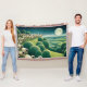 A flock of sheep roams across rolling hills under a starry night sky, with a bright full moon illuminating the landscape. The scene captures the tranquility of the countryside, with lush, green fields and neatly arranged trees.