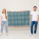 Impression plaid en vert, turquoise, bleu, blues plus clair, et lancer tan sur mesure a pouf et coussins assortis.