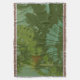L'oeuvre originale de HomeWare sur cette couverture Throw utilise une photographie originale pour créer l'illusion d'un tissu rétro ou vintage. Sur la photo, des feuilles tropicaux verdoyants, sous un soleil éclatant et une ombre profonde, s'étalent à travers un arrière - plan de ciel bleu profond. Le design est agrémenté d'une teinte verte antique et d'une texture qui lui donne un aspect de tissu de soie ancien.