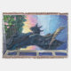 Gargoyle Guardian Art de Traci Van Wagoner imprime, affiche, accessoires et cadeaux une gargouille en pierre bleue et grise qui vous regarde de sa perche au-dessus de la ville tôt le matin avec un ciel de soleil levant texturé de jaune, orange, rose, violet et bleu. Obtenez-vous un gardien de gargoyle aujourd'hui pour garder une attention pour vous.
