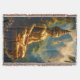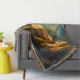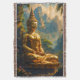 This artwork features a radiant golden Buddha statue seated in deep meditation, set against a breathtaking vista of mist-shrouded Thai mountains and lush tropical jungle. The warm, glowing light of the setting or rising sun streams through the palm fronds, highlighting the exquisite detail of the statue and casting a mystical, ethereal glow over the landscape.