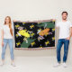 Dessin artistique de grenouilles jaunes. Grenouilles de la jungle, feuilles verts.Couleur arrière - plan personnalisée.
