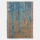 Il s'agit d'oeuvres de Gustav Klimt, Beech Grove 1, 1902. Les oeuvres d'art dépeignent une forêt dense de grands bouleaux, minces, aux troncs pâles marqués par des lignes verticales foncées. Le feuillage est dépeint dans les tons bleu, vert et jaune, ajoutant un sens de profondeur et de vibrations à la scène. Le sol de la forêt est recouvert d'une couche de feuilles orange et marron, créant un contraste saisissant avec les tronçons d'arbres plus légers. La composition globale utilise des techniques pointillistes et impressionnistes, donnant à l'image une apparence vivante et texturée. La verticalité des arbres souligne la structure sereine et rythmique de la forêt.