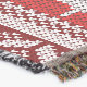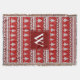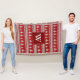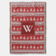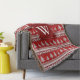Rouge et blanc Nordic fair isle inspiré motif sur une confortable couverture jetée confortable avec une lettre monogramme personnalisé blanc bouché sur un carré décoratif rouge canneberge au centre de la couverture.