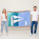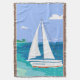 Monogram Voilier Côtier Tropical Throw Blanket. Un voilier avec votre nom sur elle s'approche d'une plage. Vue sur la mer tropicale. Bleu, turquoise, mousse de mer, turquoise, vert, blanc.