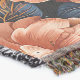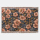 Motif floral vif avec de grandes fleurs stylisées de couleur pêche sur fond sombre. Les fleurs sont détaillées avec des textures riches et des motifs complexes, accompagnées de feuilles vertes luxuriantes et dorées qui rehaussent l'élégance générale de la composition.