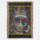 This oil painting from Amanda Diehl features a Venetian jester mask brandishing an enigmatic smile. The mask, adorned with glazed black and candy-apple red diamonds surrounded by gold scrollwork, floats on a field of burgundy damask.