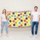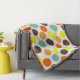 Cette couverture de lancer a une conception géométrique de points bleus, oranges, jaunes et marron.