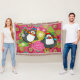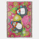 Belle couverture de Noël de Noël avec deux pingouins adorables en patins à glace, écharpes rayées, casquettes d'hiver et deux arbres décorés de Noël sur un arrière - plan de rose chaud avec des orbes de flocon de neige, un anneau rose solide avec des flocons de neige blancs, et un centre de moutarde avec des petits pois blancs. Vous pouvez facilement customiser cette jupe de fêtes avec votre nom de famille !