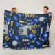 Image merveilleuse sur une couverture en toison d'un motif de style scandinave avec cerf et autres éléments de Noël. Couleurs vives en bleu royal, bleu marine, gris et jaune.