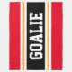 Cette conception sportive et sportive présente du texte GOALIE en gras à l'intérieur d'une large bande noire surlignée avec deux bandes de course blanches et jaunes contre des bandes extérieures rouge vif. Le texte peut être personnalisé.