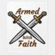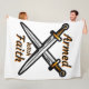 Cette couverture en toison affiche les mots "Armé de Foi" dans un avant imprimé unique avec des lettres noires orange encadrées d'un ensemble d'épées croisées au centre avec ce thème de citation basé sur la foi. Cette couverture est faite à partir d'une toison de polyester souple et confortable à 100% en butterie avec une sublimation pleine couleur éclatante de bord à bord et une couture à double tranchant avec une machine arrière de couleur blanc cassé lavable.