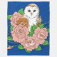 Une chouette grange avec un croissant de lune sur le front est assise parmi des fleurs roses sur un fond de bleu foncé.